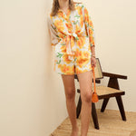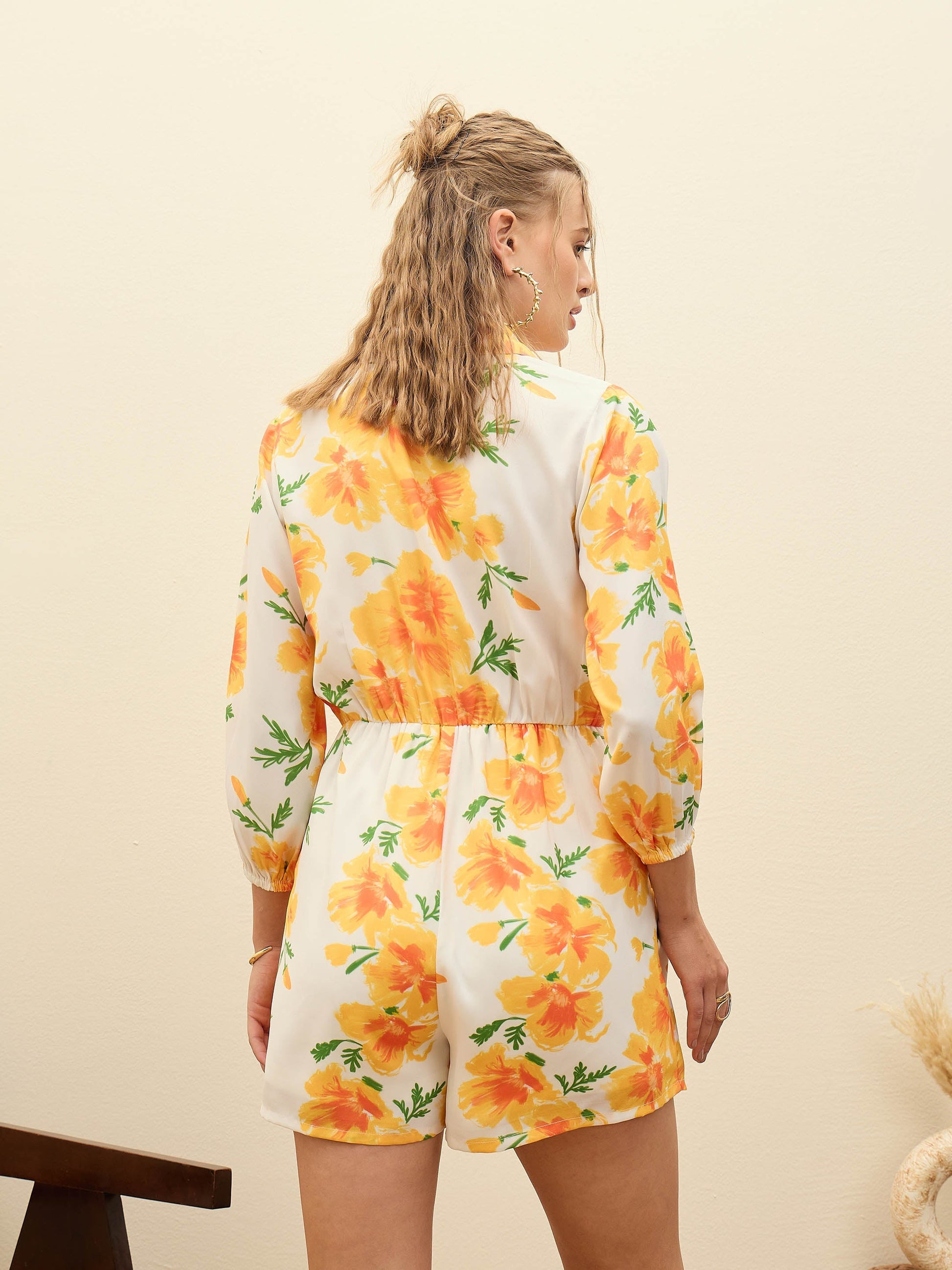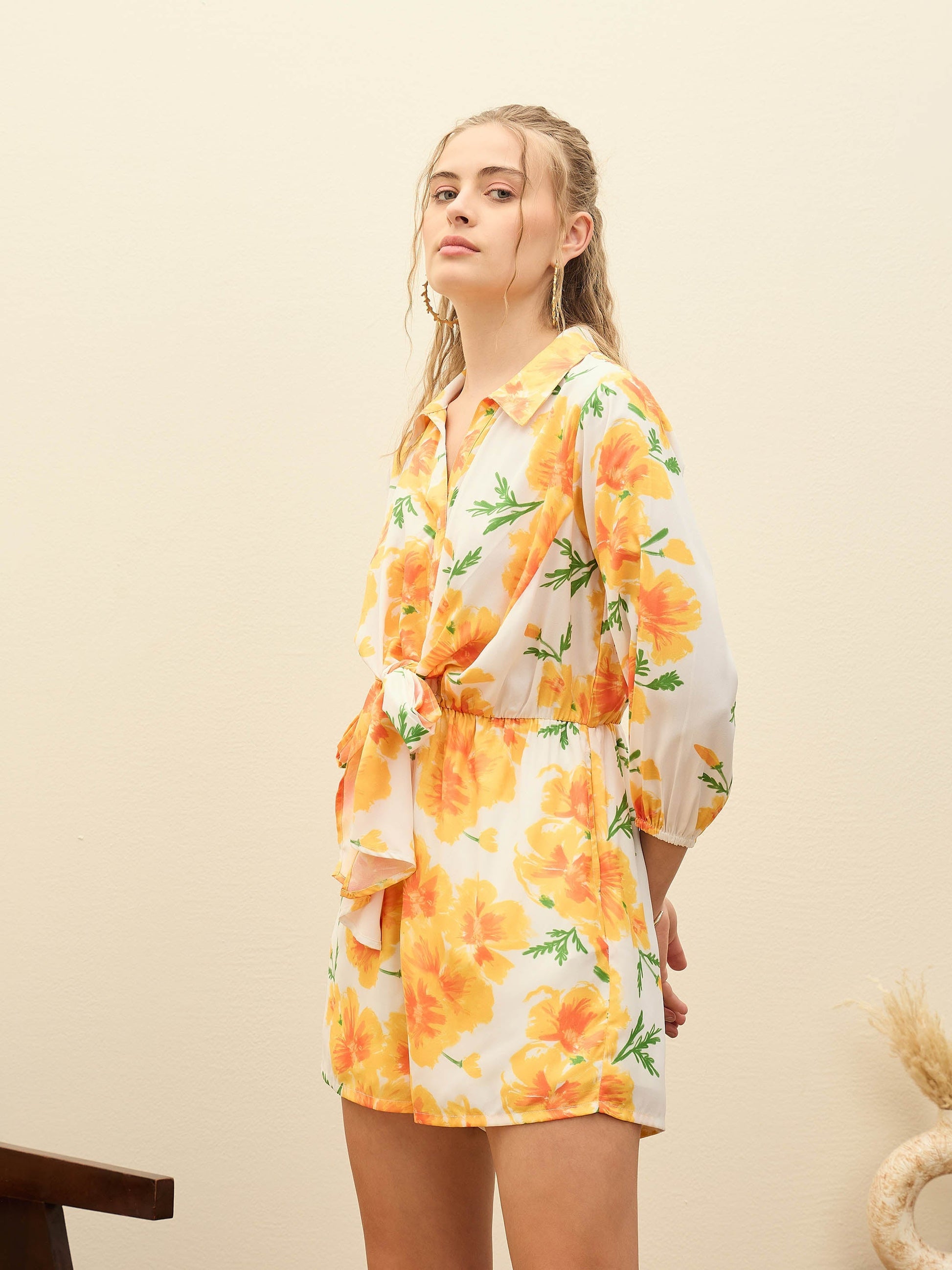 Yellow Floral Tie-Knot Playsuit, in Summercool fabric, Polyknit Lining, Above Knee, Comfort Fit, Button Closure, Straight Hemline and features Tie Detail At Front
