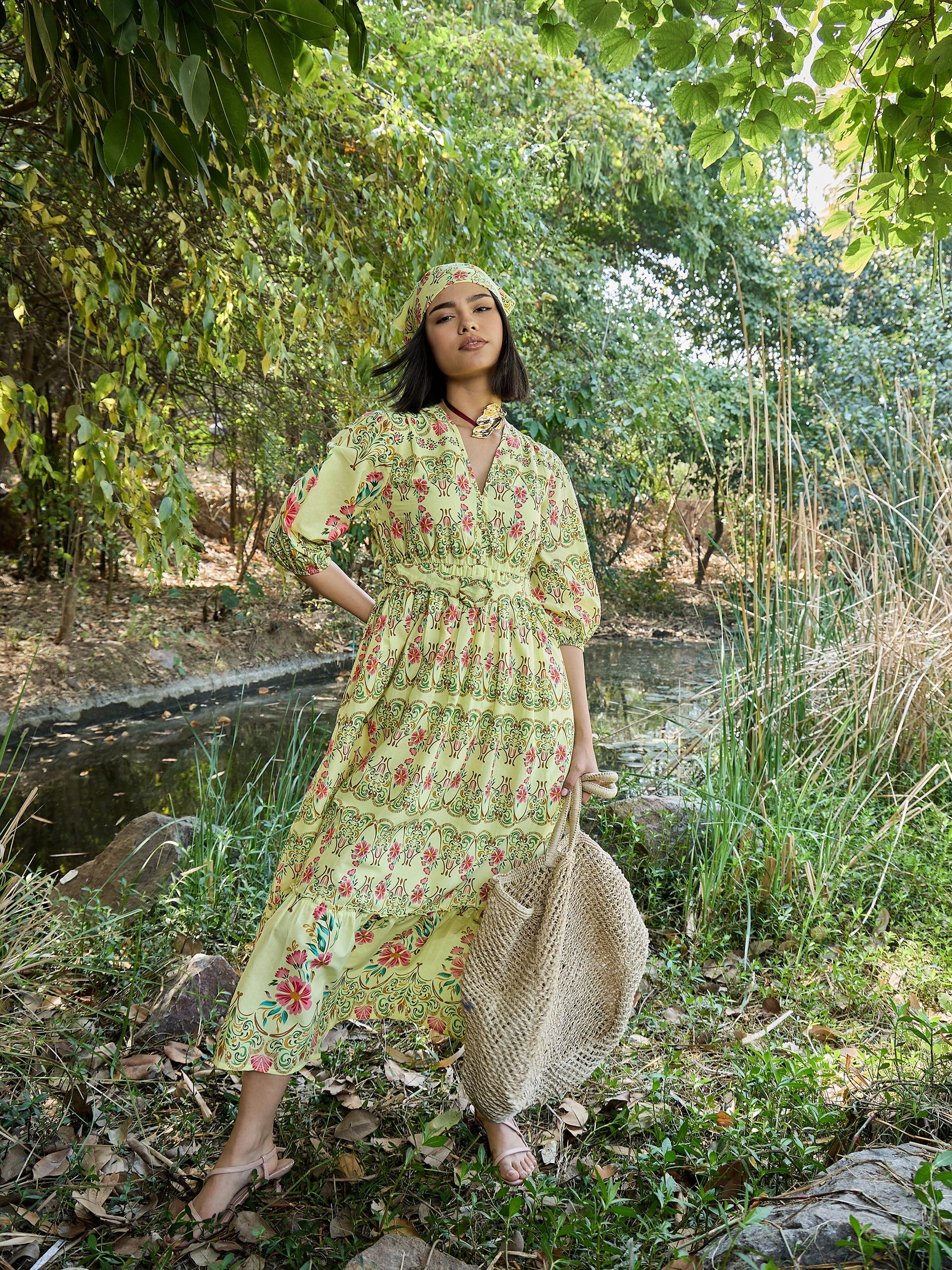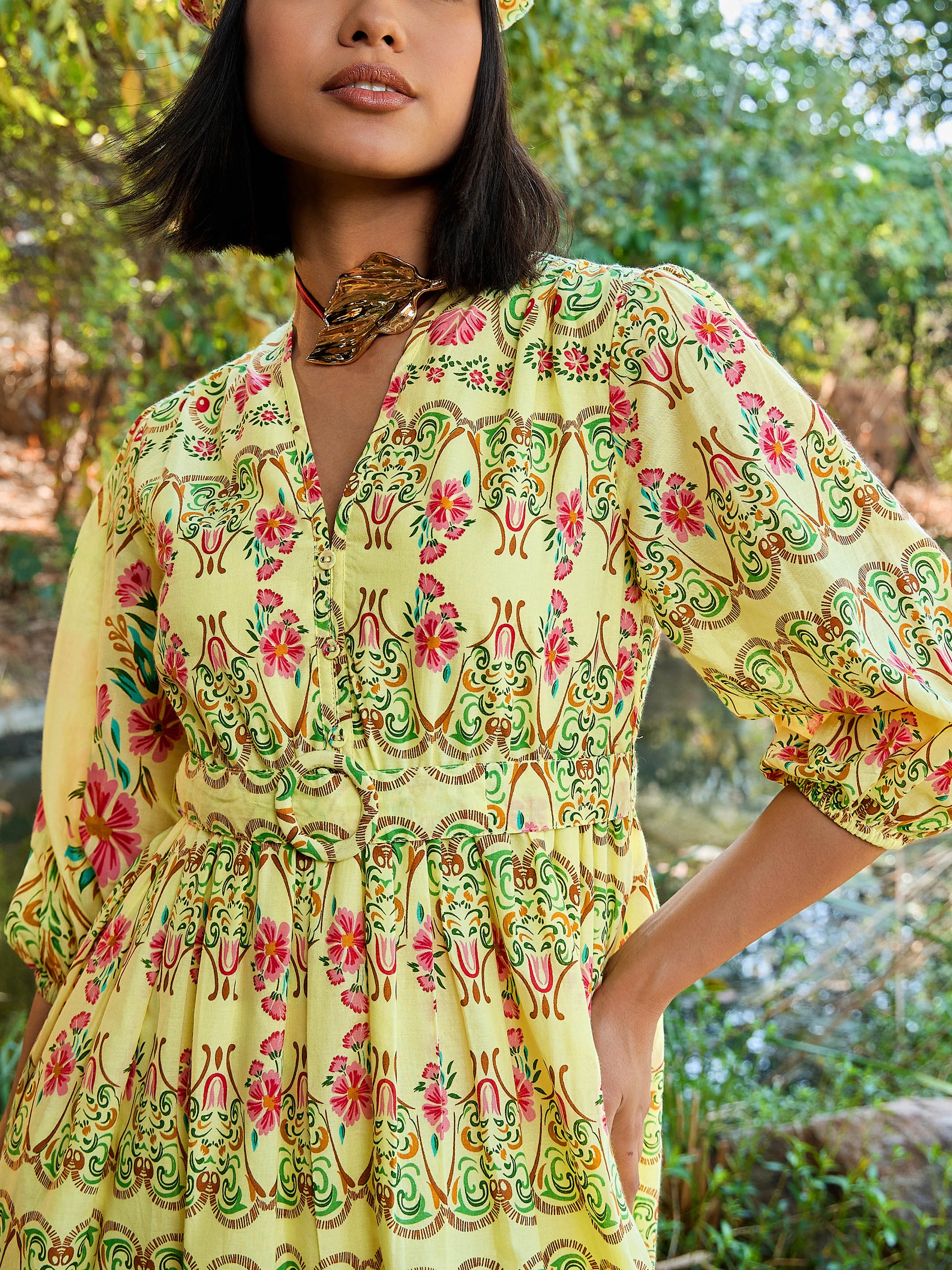 Yellow Floral V Neck Gathered Midi Dress, in Cotton Cambric fabric, Cotton Voile, Midi Length , Fit & Flare, Button Closure, Flared Hemline and features Pocket Detail Side