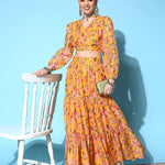 Women Yellow Floral Wrap Crop Top With Tiered Skirt