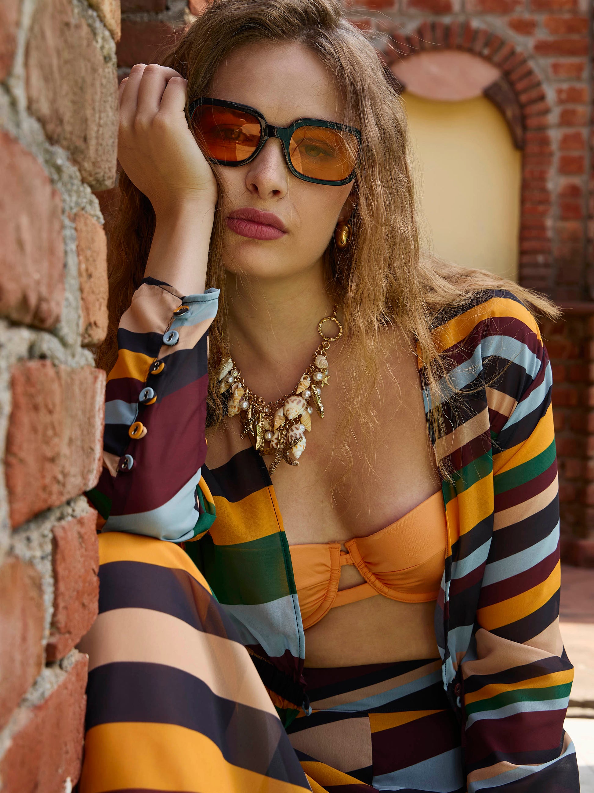 Women Yellow Multicolor Stripes Top With Flared Pants