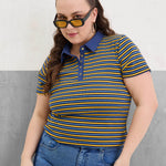 Yellow & Navy Rib Stripe Polo Neck Top, in Rib fabric, Unlined, Regular Length, Comfort Fit, Button Closure, Straight Hemline and features Golden Button At Front