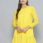 Yellow Pin Dot Frill Hem Dress, in Rivera Crepe fabric, Polyknit Lining, Above Knee, Comfort Fit, Button Closure, Straight Hemline and features Lace Detail AT Neck and Sleeves