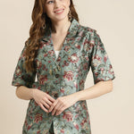 Olive Floral Short Sleeves Blazer, in Poly Silk fabric, Cotton Lining, Regular Length, Comfort Fit, Button Closure, Straight Hemline and features 2 Wooden Buttons At Front