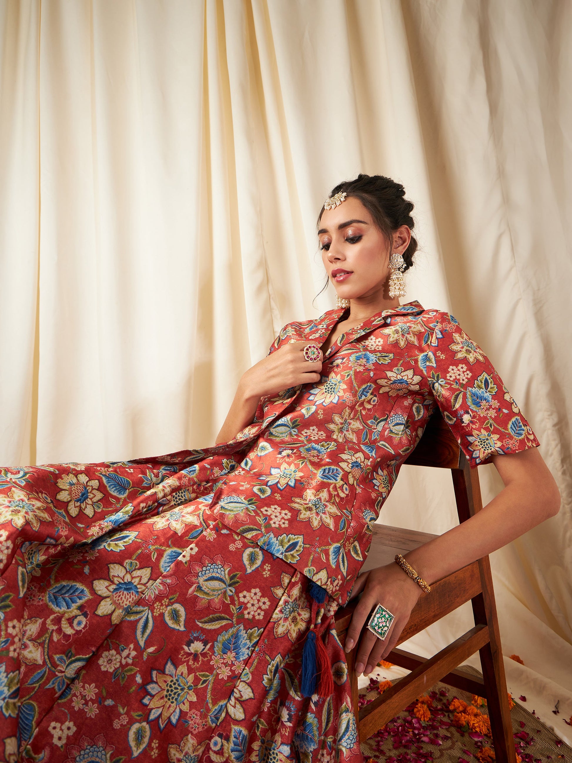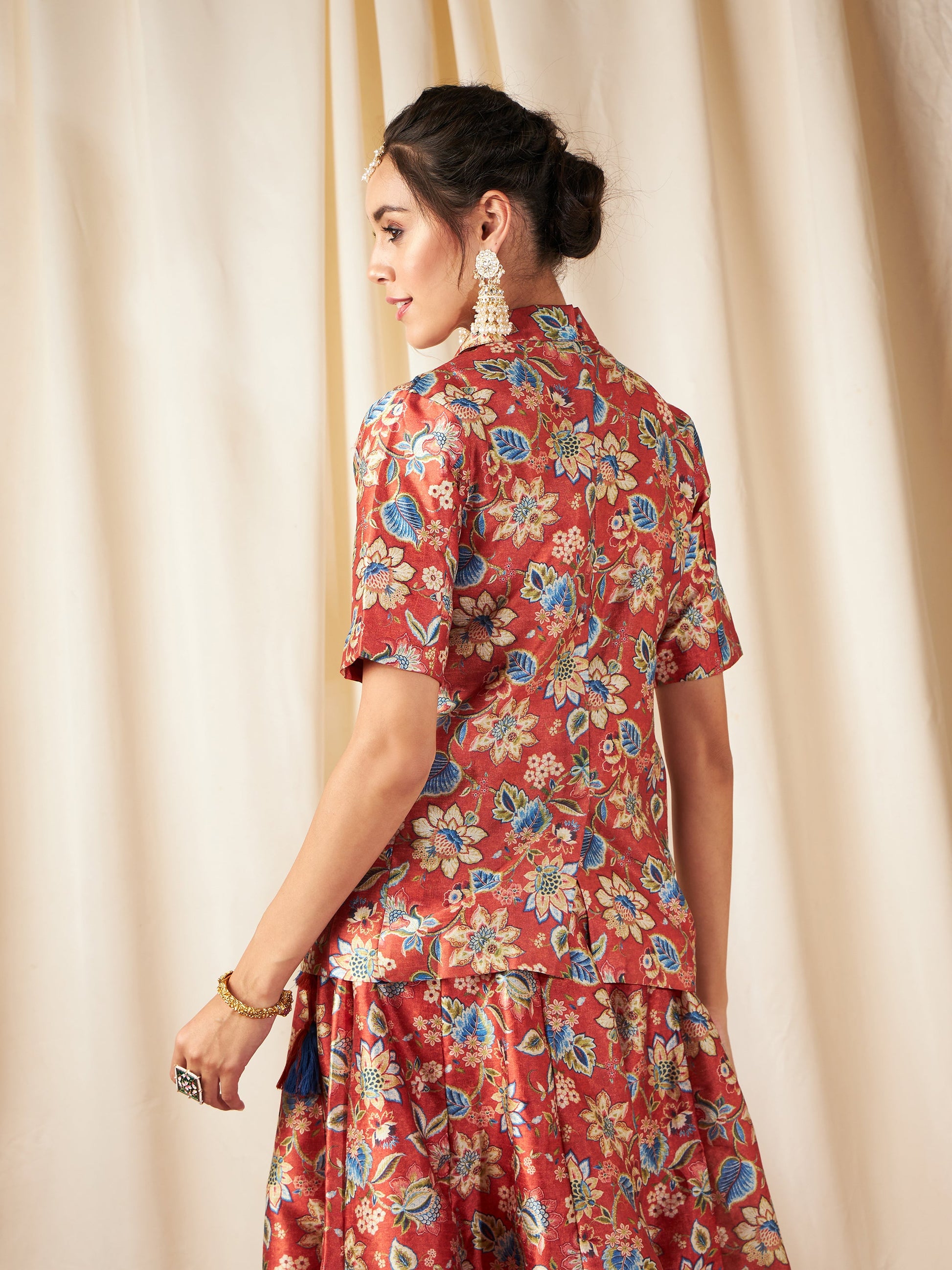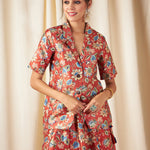 Orange Floral Short Sleeves Blazer, in Poly Silk fabric, Cotton Lining, Regular Length, Comfort Fit, Button Closure, Straight Hemline and features 2 Wooden Buttons At Front