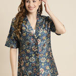 Navy Floral Short Sleeves Blazer, in Poly Silk fabric, Cotton Lining, Regular Length, Comfort Fit, Button Closure, Straight Hemline and features 2 Wooden Buttons At Front