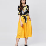 Black Printed Half Sleeve Tops With Yellow Calf Length Skirt With Belt