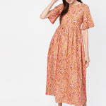 Peach Floral Printed Bell Sleeves Gathered Maxi Dress