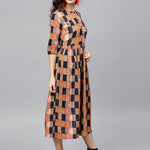 Multi ColoredRound Neck Checked Dress With Front Placket And 3/4 Sleeves