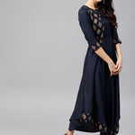 Navy Blue3/4Th Sleeve Printed Maxi Dress With Round Neck