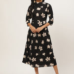 Black Floral Printed Shirt Collar Cotton Fit and Flare Dress