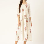 White Floral Printed Round Neck Cotton Fit and Flare Dress