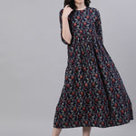 Navy Blue Floral Printed Round Neck Cotton Maxi Dress