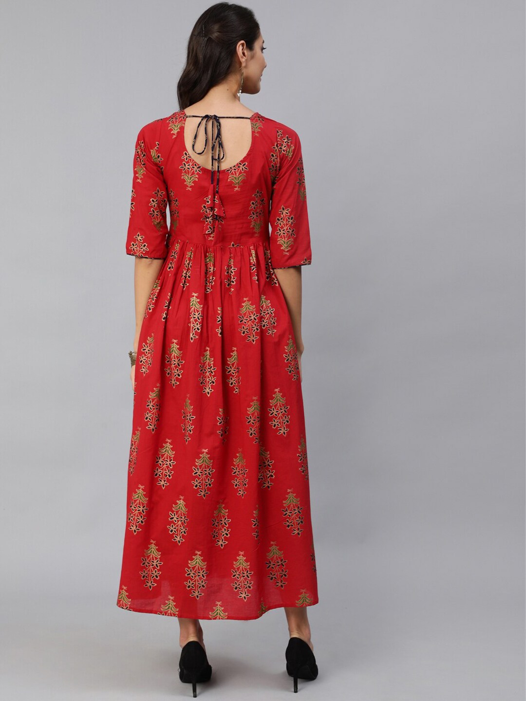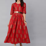 Women Red & Gold Printed Maxi Dress With Three Quarter Sleeves
