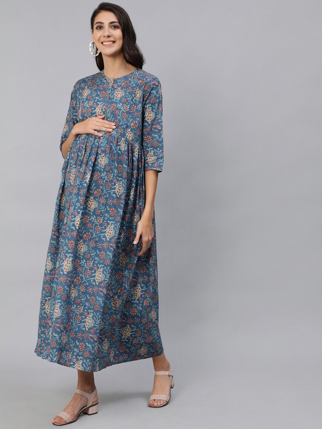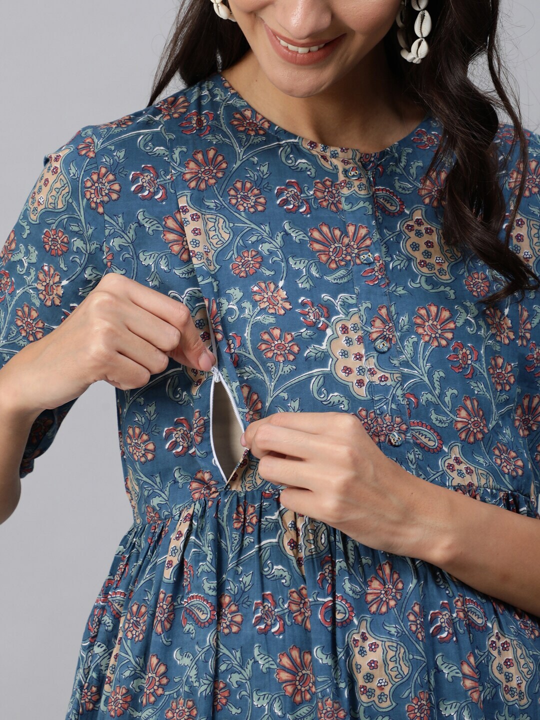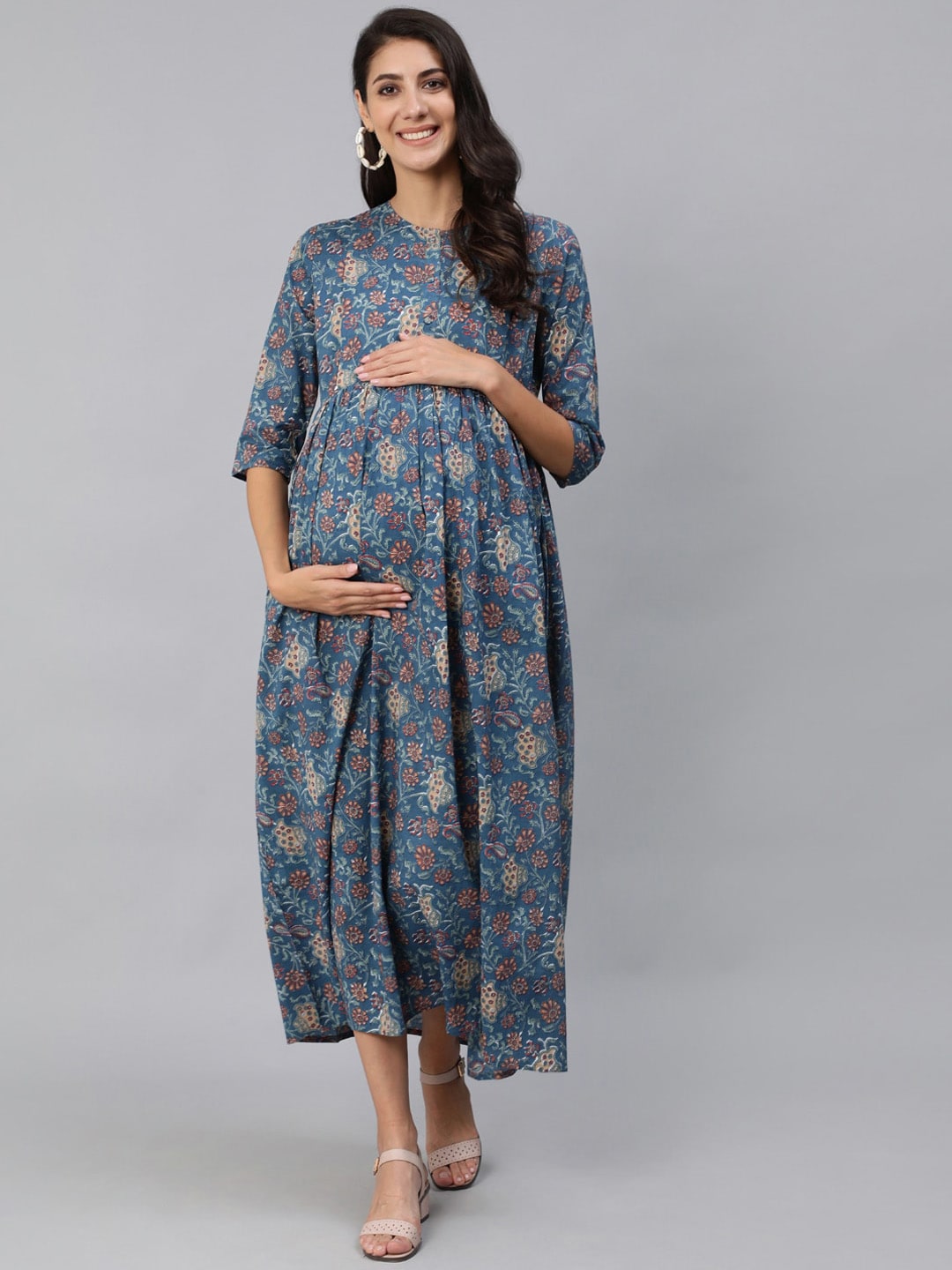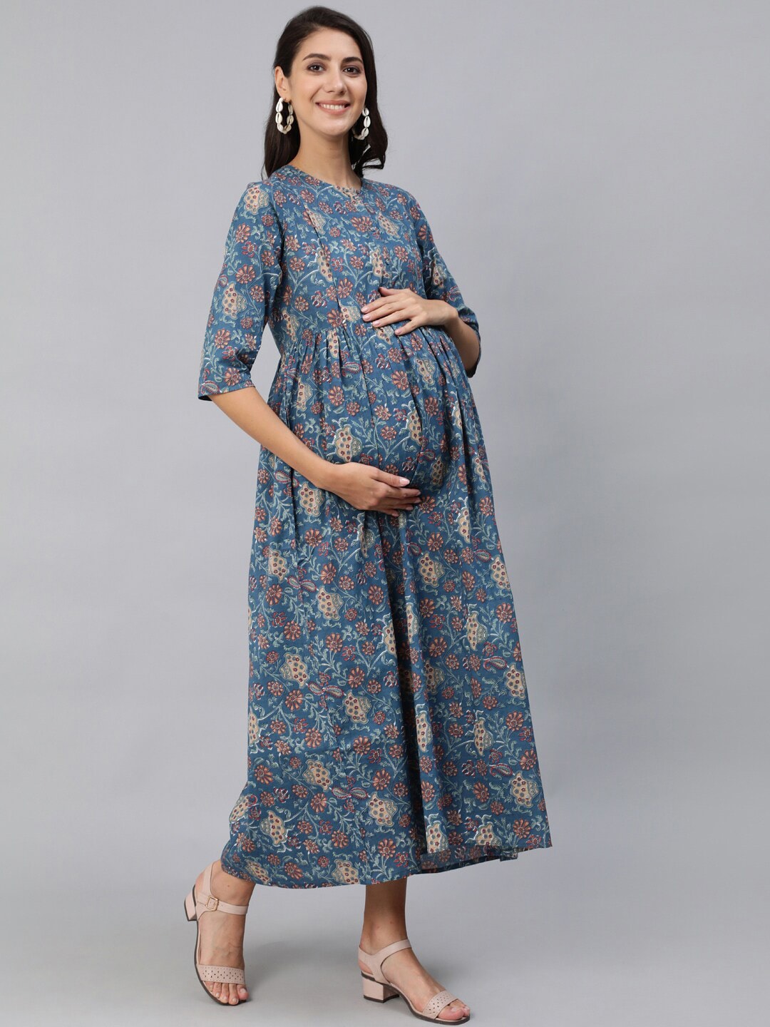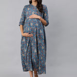 Women Blue Floral Printed Maternity Dress With Three Quarter Sleeves