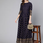 Blue Printed Flared Dress With Three Quarter Sleeves