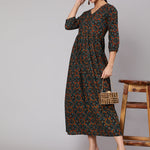 Green Abstrac Printed Gathered Dress With Three Quarter Sleeves