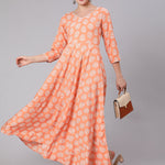 Peach Floral Printed Dress With Three Quarter Sleeves