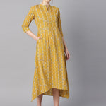 Mustard Yellow Color Ikat Printed Chinese Collar Dress With Placket Opening.