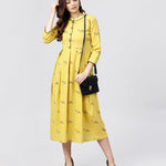 Mustard Full Sleeves Cotton Maxi Dress With Madarin Collar And Front Placket