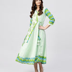 Green Printed Cotton Angrakha Style Dress WithMadarin Collar Emblished With Tassels