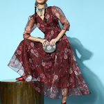 Maroon Floral Wrap Anarkali Maxi Dress, in Organza fabric, Polyester Lining, Maxi Length, Fit & Flare, Zipper Closure, Flared Hemline and features Wrap Neck Detail