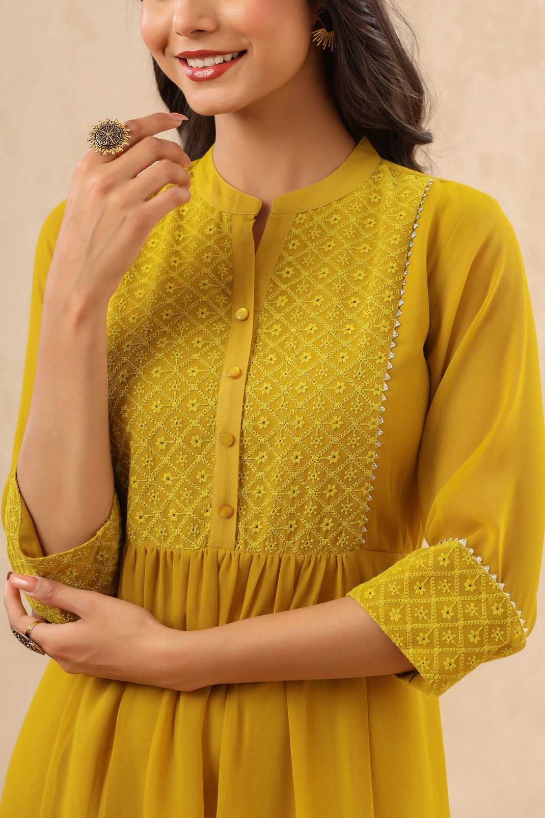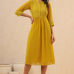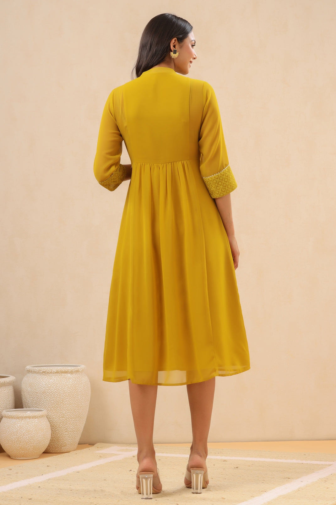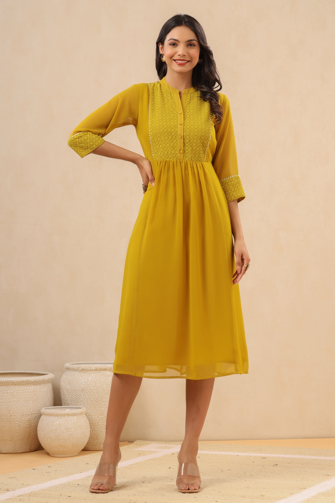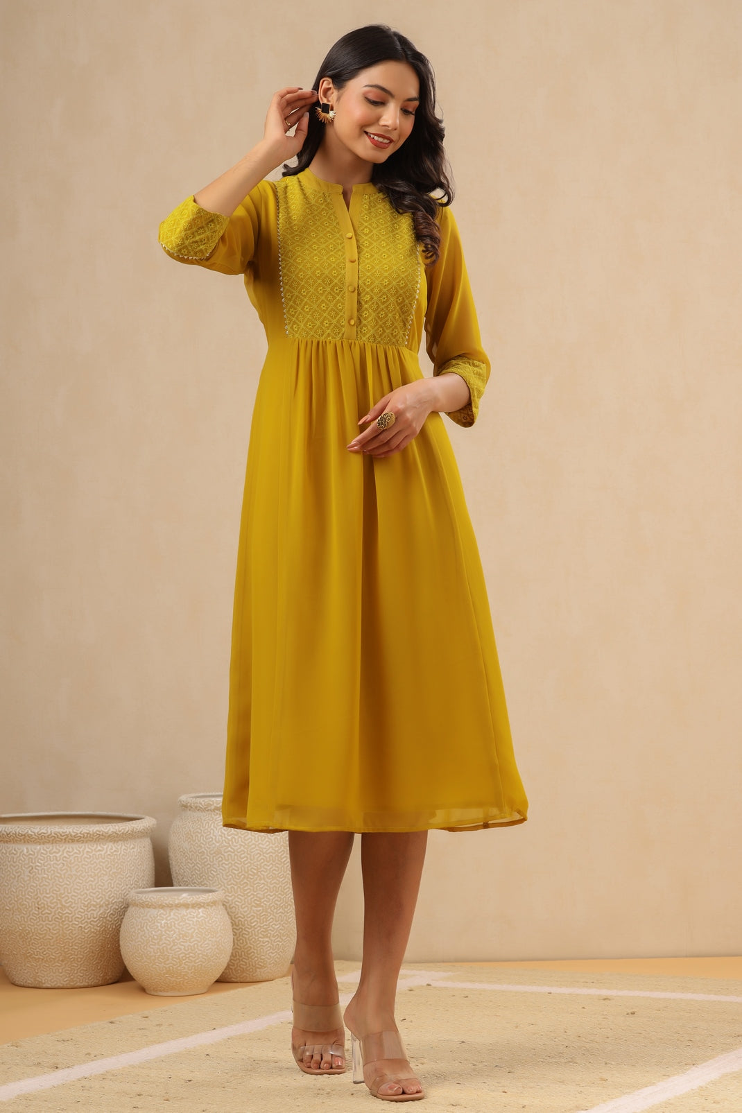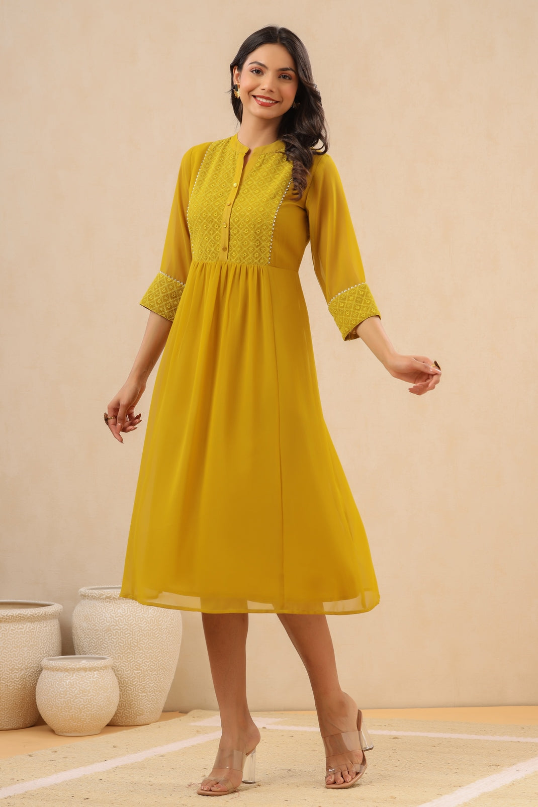 Women`s Mustard Georgette Embroidered A-Line Dress