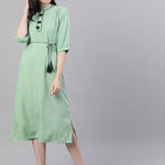 Green Solid Fit and Flare Dress with Embroidered Yoke