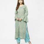 Green Printed Full Sleeve Cotton Long Straight Kurta