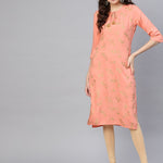 Peach Gold Khari Printed 3/4Th Sleeve Rayon Kurta With Dori Work At Yoke