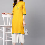 Mustard Yellow Embroidered Straight Rayon Kurta With 3/4Th Sleeves