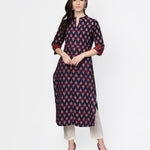 Blue Printed 3/4Th Sleeve Cotton Straight Kurta
