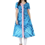 Blue Printed Half Sleeve A-Line Rayon Kurta With Dori Work At Yoke