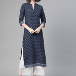 Women Navy Blue & White Cotton Straight Ethnic Motifs Printed Kurta