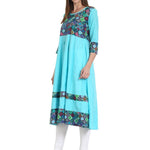 Women Printed Turquoise Blue Three-Quarter Sleeves Scoop Neck Cotton Anarkali Kurta