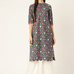 Blue Three-Quarter Sleeves Straight Floral Printed Cotton Kurta