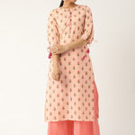 Peach Three-Quarter Sleeves Straight Floral Printed Cotton Kurta