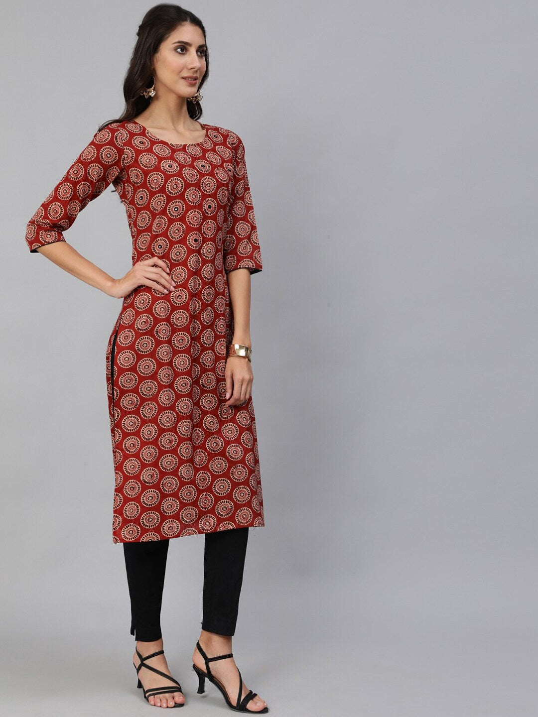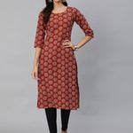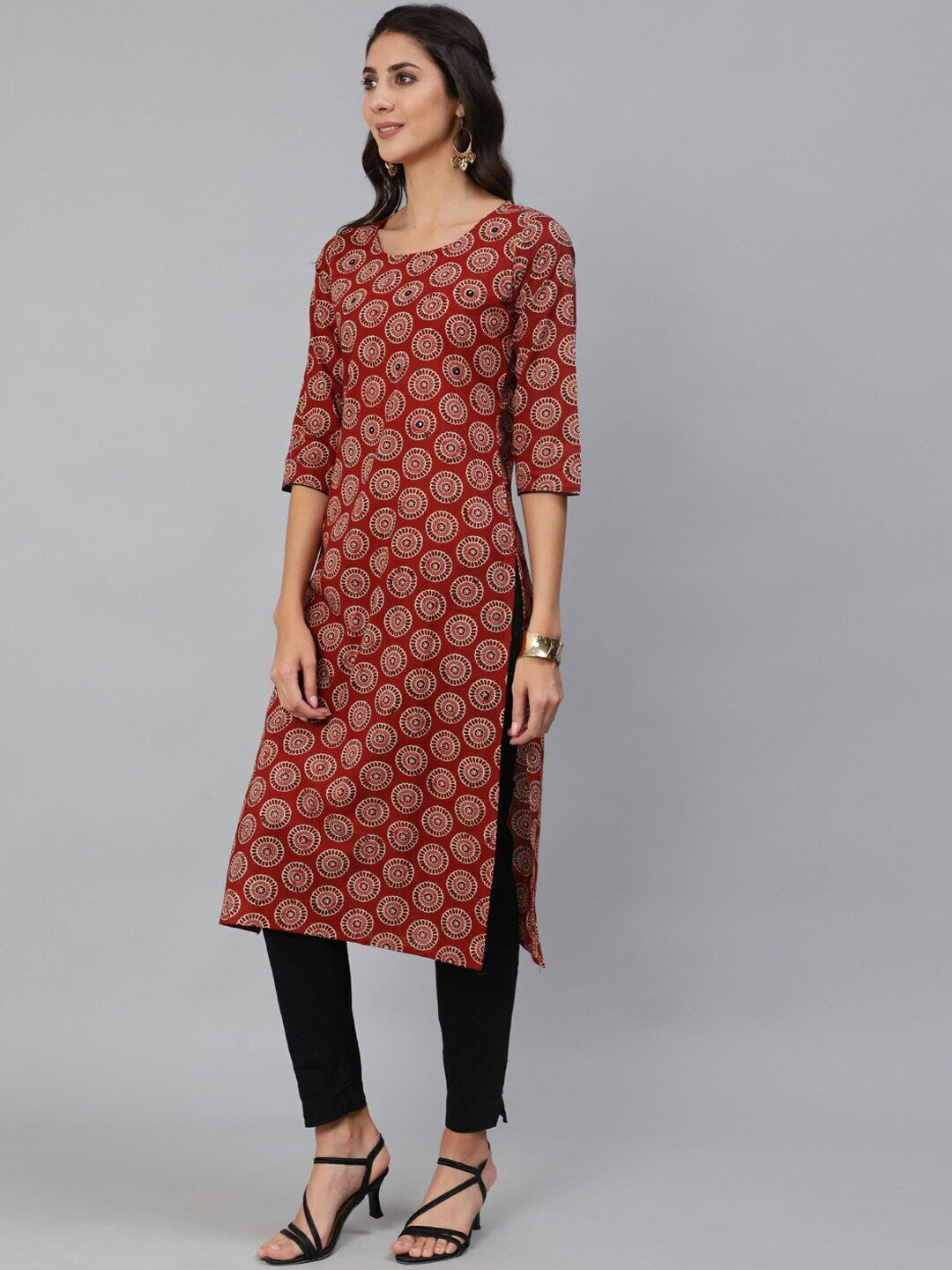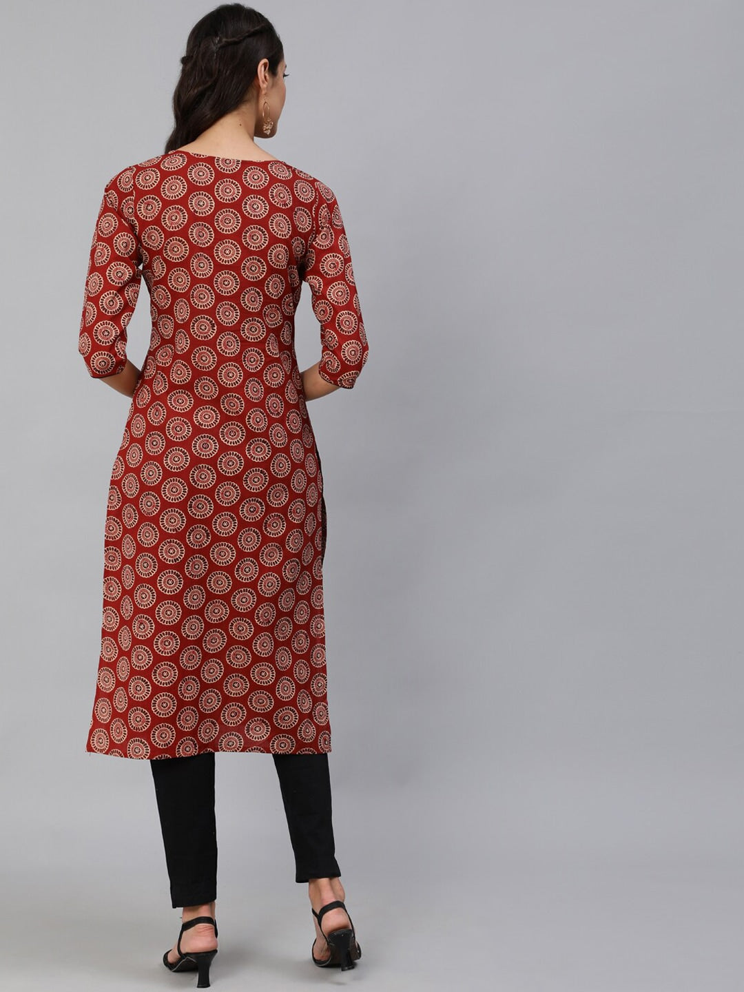 Women Maroon Embroidered Straight Kurta With Three Quarter Sleeves