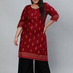 Plus Size Women Maroon & Gold Printed Staright Kurta With Three Quarter Sleeves