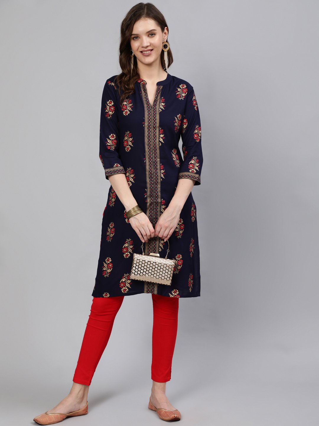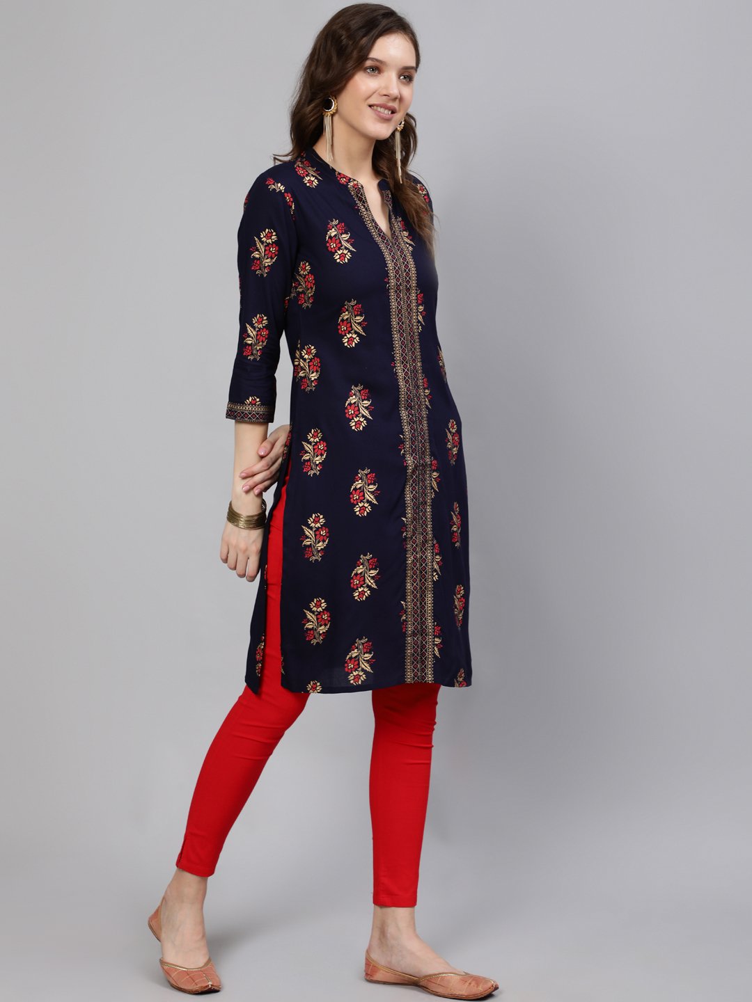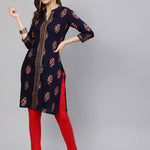 Women Navy Blue Straight Kurta With Three Quarter Sleeves