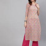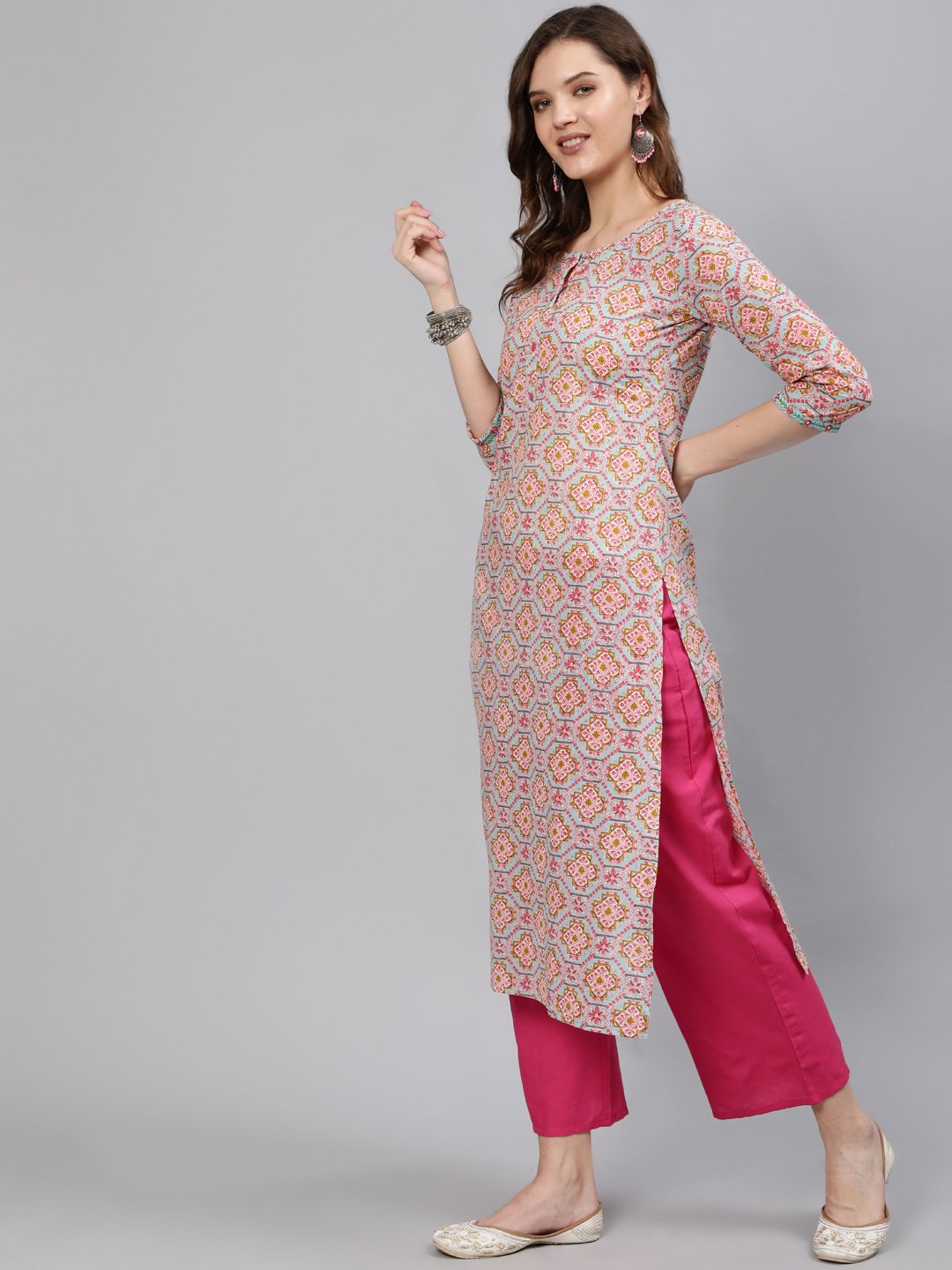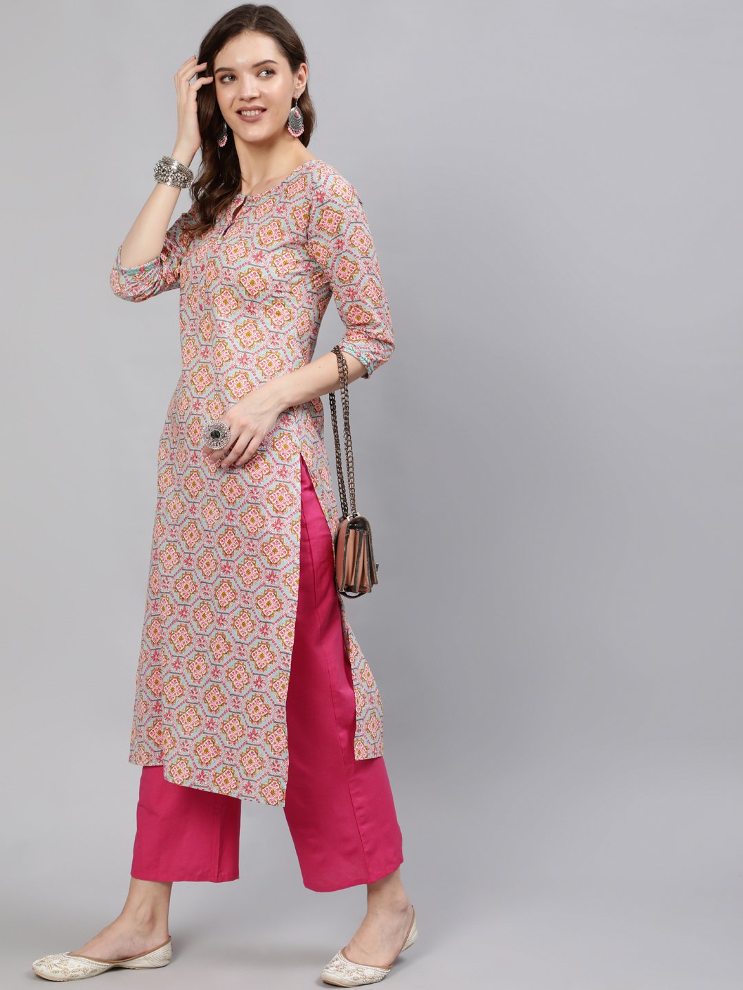 Women Blue Embroidered Mirror Work Printed Straight Kurta With Three Quarter Sleeves