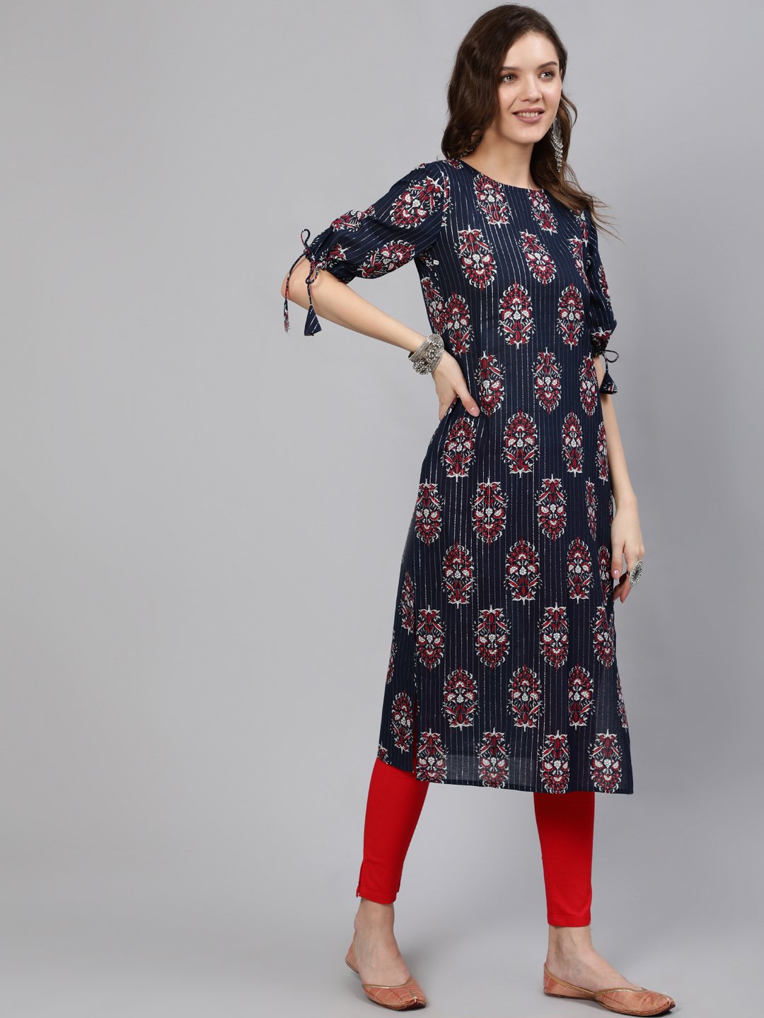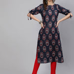 Women Navy Blue Printed Straight Kurta With Half Sleeves
