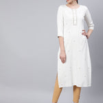 Women Off White Embroidered Straight Kurta with Three Quarter Sleeves