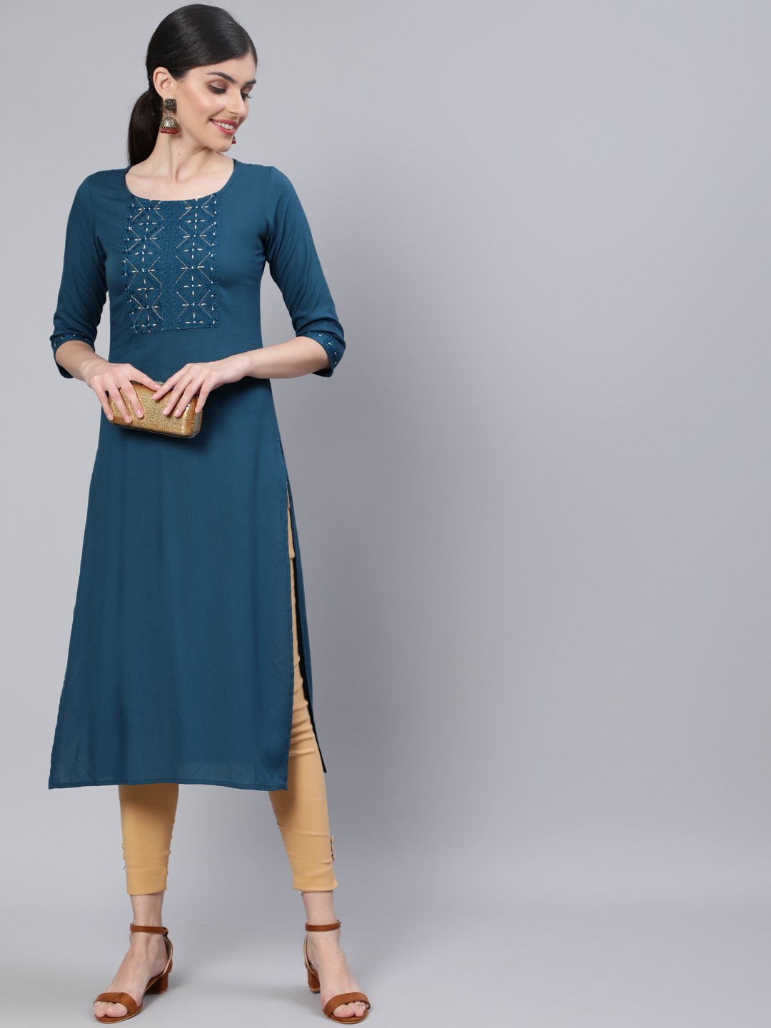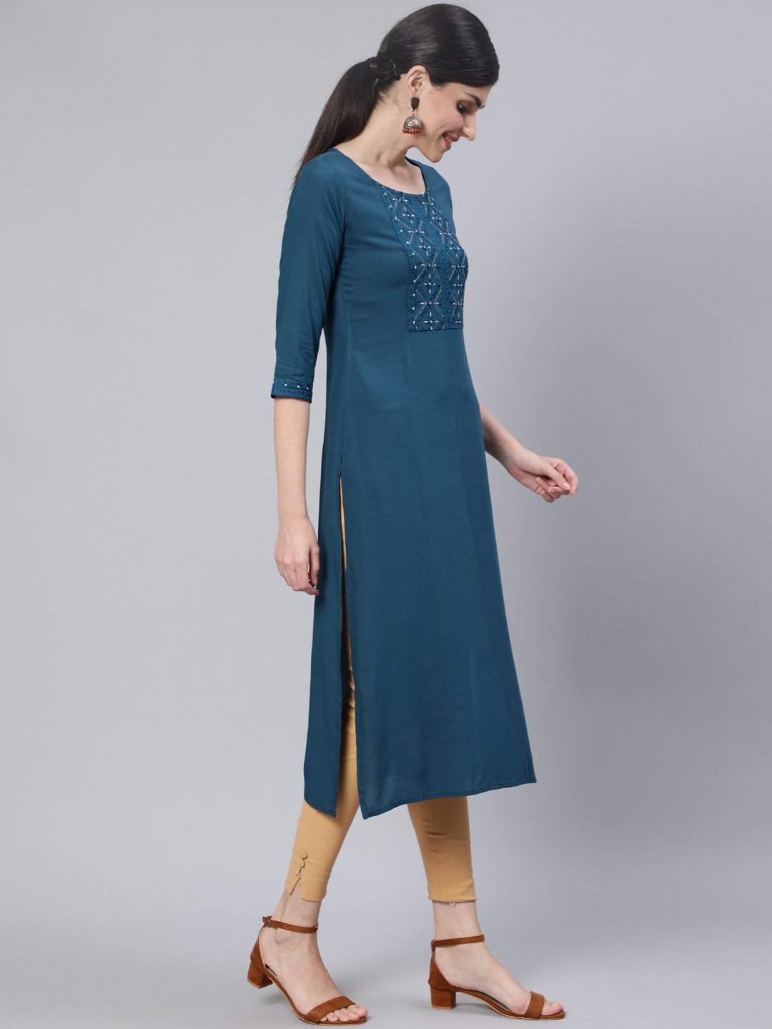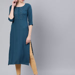 Women Teal Blue Embroidered Straight Kurta with Three Quarter Sleeves