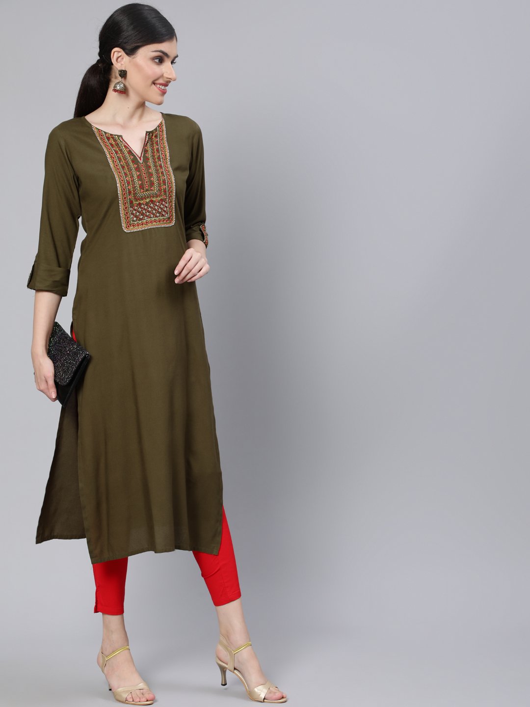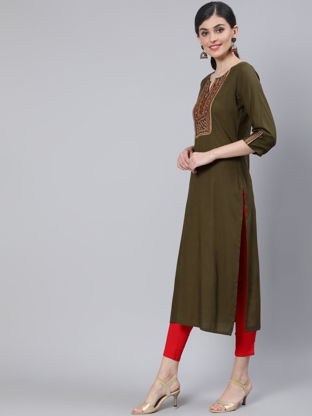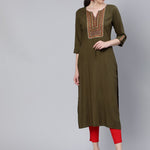Women Olive Green Embroidered Straight Kurta with Three Quarter Sleeves