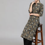 Black Floral Printed Kurta With Three Quarter Sleeves