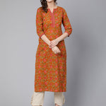 Mustard Floral Printed Straight Kurta With Three Quarter Sleeves