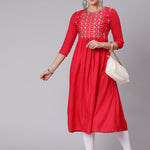 Rayon Calf Length Embroidered A-line 3/4 Sleeve Round Neck Kurta