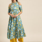 Turquoise Floral Cold Shoulder Midi Kurta