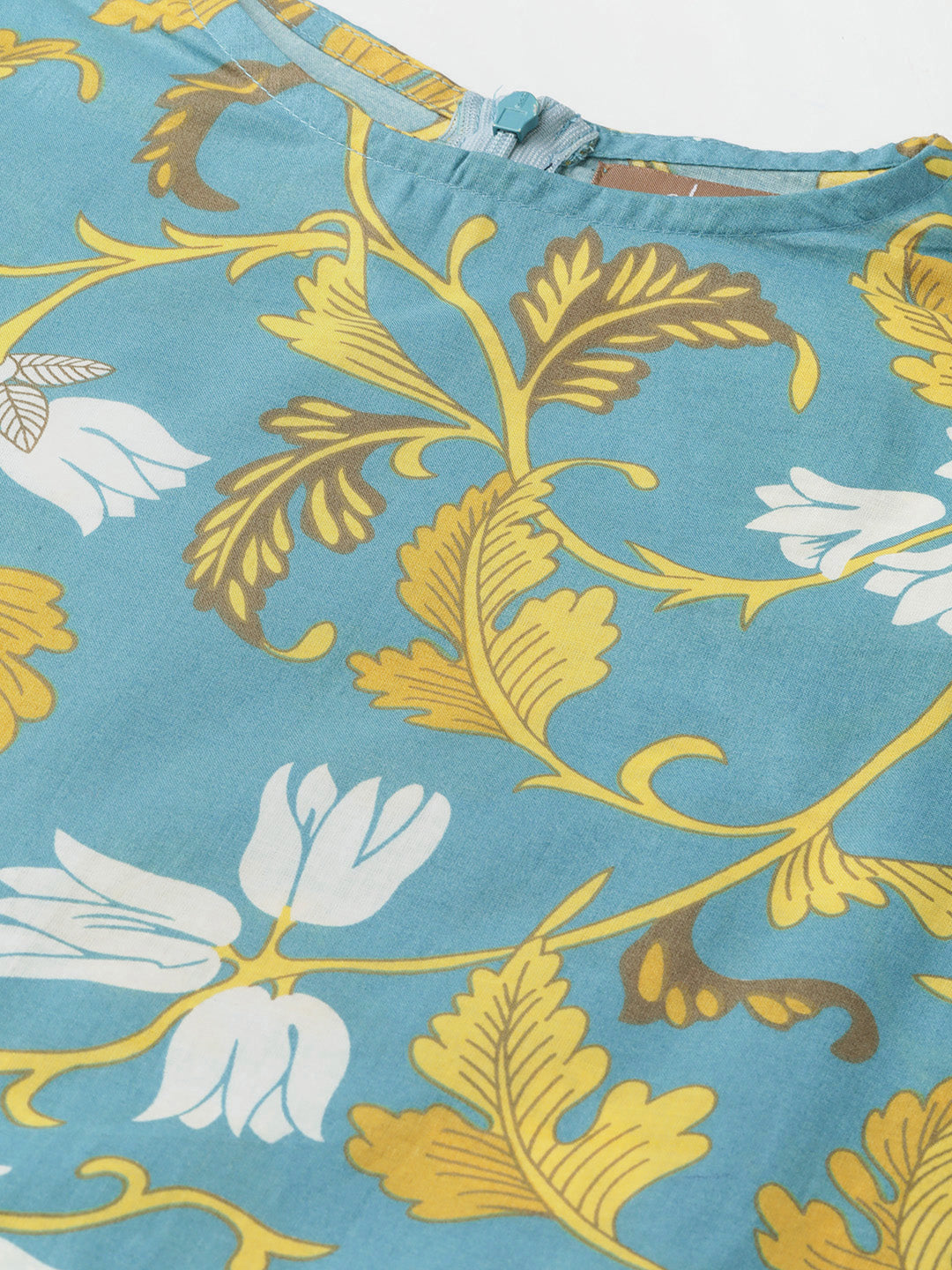 Turquoise Floral Cold Shoulder Midi Kurta, in Rayon fabric, Cotton Lining, Calf Length, Fit & Flare, Zipper Closure, Flared Hemline and features Cold Shoulder Detail