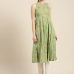 Green Printed Sleeveless Kurta, in Rayon fabric, Cotton Lining, Below Knee, Fit & Flare, Zipper Closure, Flared Hemline and features Box Back Detail At Back